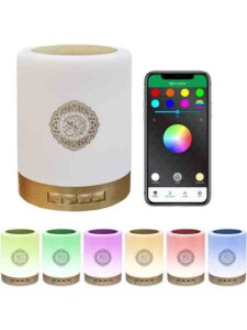 Touch Lamp Portable Quran Speaker SQ-112 Best Gift for the Sacred month of Ramazan New Boxed Touch Lamp Quran Speaker with Bluetooth functionality Please refer to the photos attached for exact item details. A. Choose Quran Kareem, MP3 and FM Radio B. Short press to increase the volume and long press to play front C. Pause or play, Long press to change to the reader D. Short press down the volume, Long press to play the next Surah E. Power button, Long press 3 Seconds to boot, Press 2 Seconds off F. TF Card G. Audio input H. USB charging port I. Short touch change brightness, touch 2 seconds to switch to colour light The Touch Lamp Portable Quran Speaker has most of the Top Qarees (Reciters) Mishary Rashid Alafasy, Abdul Basit Abdul Samad, Muhammad Siddiq Minshawi, Maher Al Mueaqly, Hani Ar-Rifai, Saud Al-Shuraim, Muhammad Siddiq Minshawi with Kids, Mohammad Ibrahim, Abdurahman Sudais, Saad Al Ghamidi, Sheikh Ali Hudaify, Mahmood Khalil Husary, Mohammad Ayub, Ibrahim Akhdar The Touch Lamp Portable Quran Speaker has 18 Translations in different languages such as; 1. English 2. Somali 3. French 4. Urdu 5. German 6. Indonesian 7. Malaysian 8. Pashto 9. Dari 10. Tamil 11. Persian 12. Russian 13. Swahili 14. Albanian 15. Turkish 16. Hindi 17. Uzbek 18. Portuguese. It Includes Sahih Al-Bukhari, Sahih Al-Mulsim, Tafseer Quran Kareem, AL-Ruqyah, Hisnul Muslim And Qaida Noorania. Speaker Output Power 3W Audio Input: Aux, Micros, SD Card Input Power Input Dc 5V/800mA Frequency Response: 50Hz-20KHz Transmission Range 10 Meters Driver Unit 52mm, 4ohm, 3W Battery Li-Ion: 3.7V Lamp Power 1.6W Colour Warm White Dimension: 95mm x 122mm